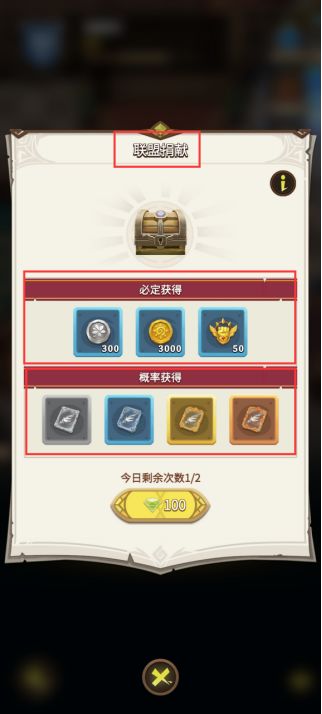 在联盟内,玩家每日可捐赠2次,首次捐献免费,第二次捐献需花费100钻石。参与捐献的联盟成员可获得联盟币、金币、联盟经验,并有概率获得天使牌碎片。