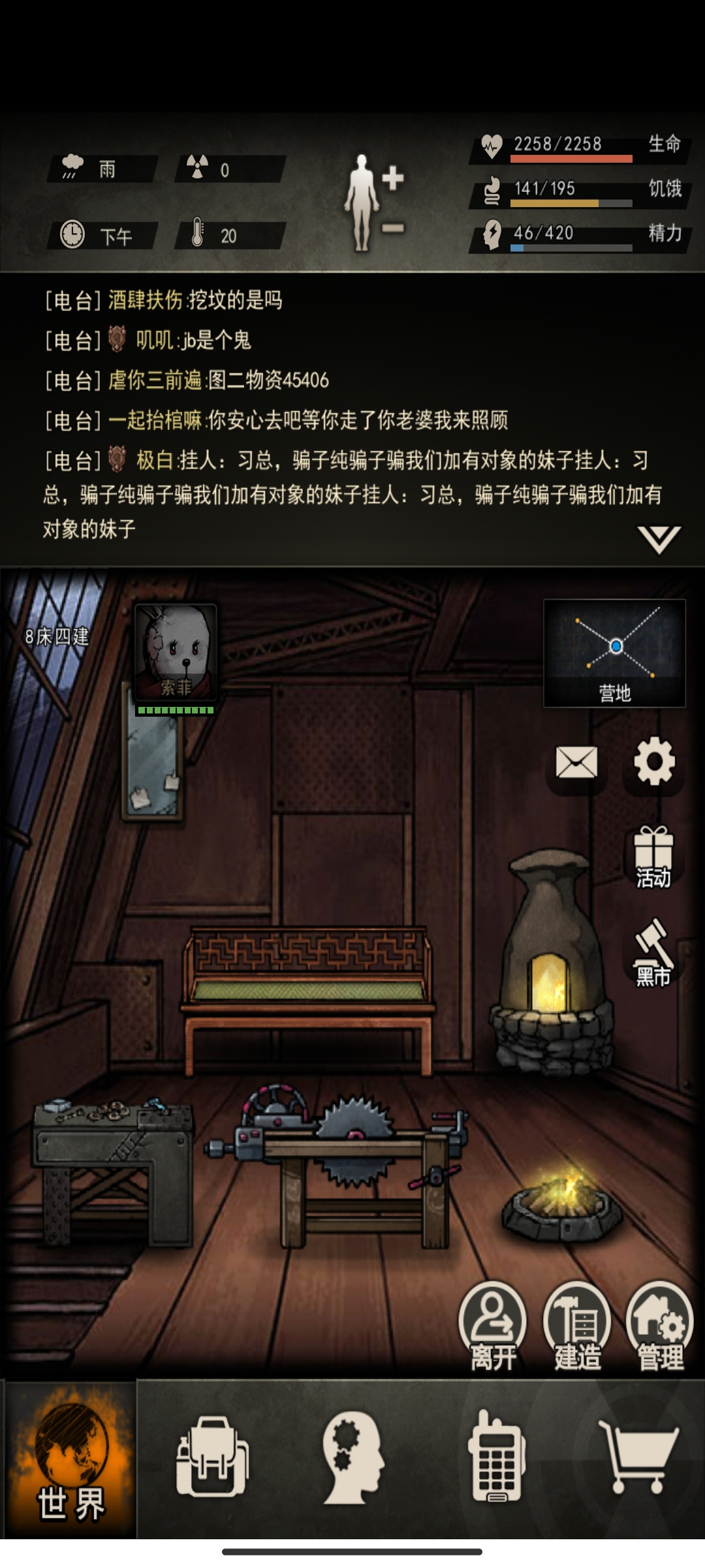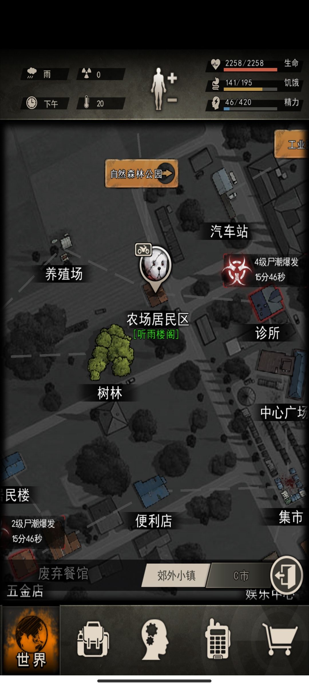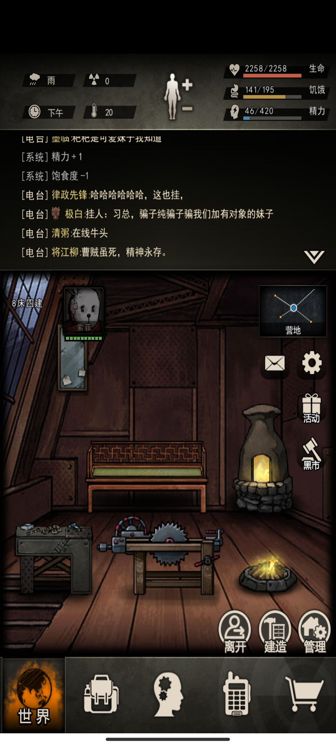 小退功能:节省精力快速回家比如组织修刀,尸潮物资回家放东西,摩托车则可以无精力快速躲怪