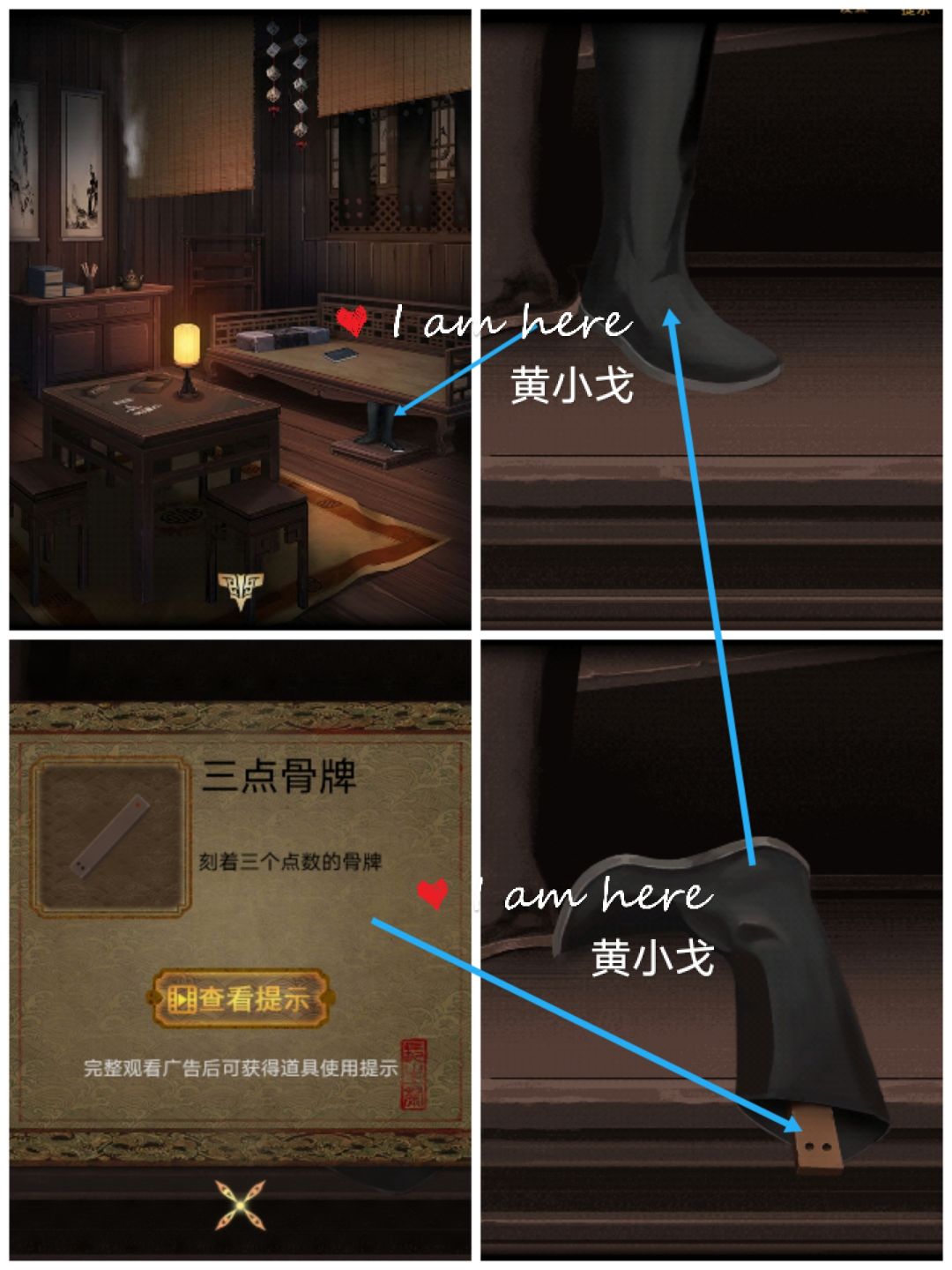 1.(二楼-大少爷房间)点击靴子,在靴子里面获得【三点骨牌】(有小高能)