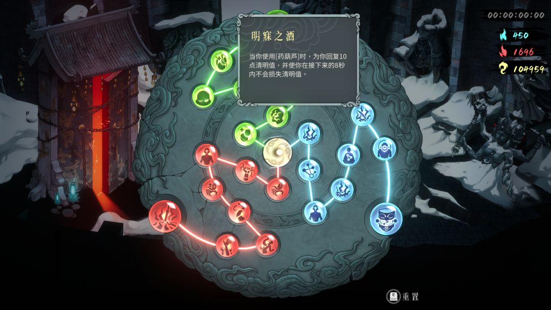 这是我本人端游的科技树截图,红色代表攻击,绿色代表清明值回复,蓝色代表减少清明值的消耗,在前期建议优先点绿色和蓝色,因为许多人在dlc前期之所以通不了关很大程度上并不是因为伤害不够,而是打到一半清明值没了,清明值会随着时间慢慢减少,减到零时,即使你的生命值为满的也一样会嗝屁,因此前期清明值的续航就显得尤为关键,接下来放出一些比较关键的技能点供大家参考