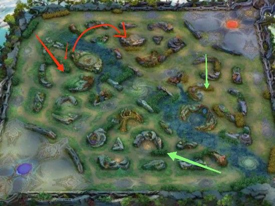 敌方打野前期弱势或者敌方阵容前期偏弱无控制。先打掉自家弹簧花跳到敌方红区(红色箭头位置),记得发信号给中路,防止被反抓了