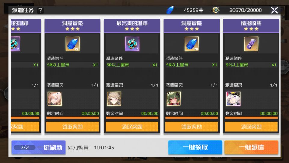 派遣任务在远征副本界面的右上角位置,每个任务都会有不同的派遣条件,包括星灵数量、派遣星灵及派遣时间,派遣后会消耗2000情报值。点起派遣后,只需要玩家等待即可,无需其他操作。时间结束后,即可领取该派遣任务对应的奖励。