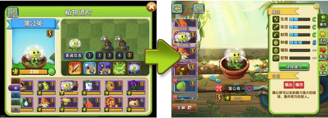 新版界面将会整合进阶、装扮(挂件)、家族等功能,实现了上述功能的快捷操作,大幅度缩短了界面切换所浪费的无效时间,养成植物一步到位。同时全新引入属性页面,提供多维度的植物分析,帮助各位小僵僵立刻get植物属性和技能介绍,战斗更加得心应手。