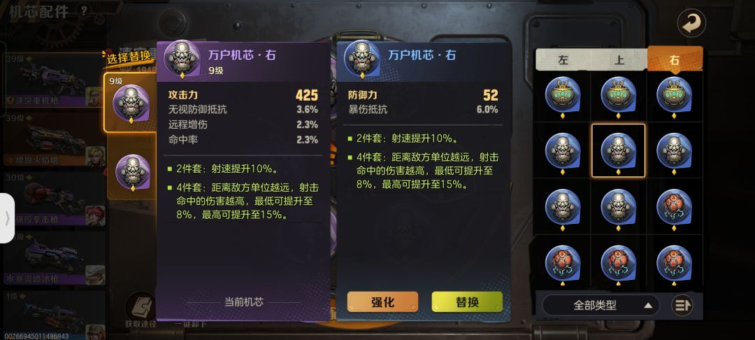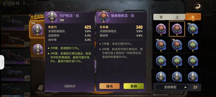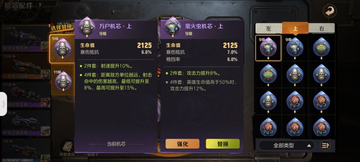 左边卡槽的两个部位的机芯主属性只有攻击的,上卡槽只有生命,这两个卡槽不能有更多的选择,(无非就是同主属性下的副属性抵挡,爆伤百分率等),