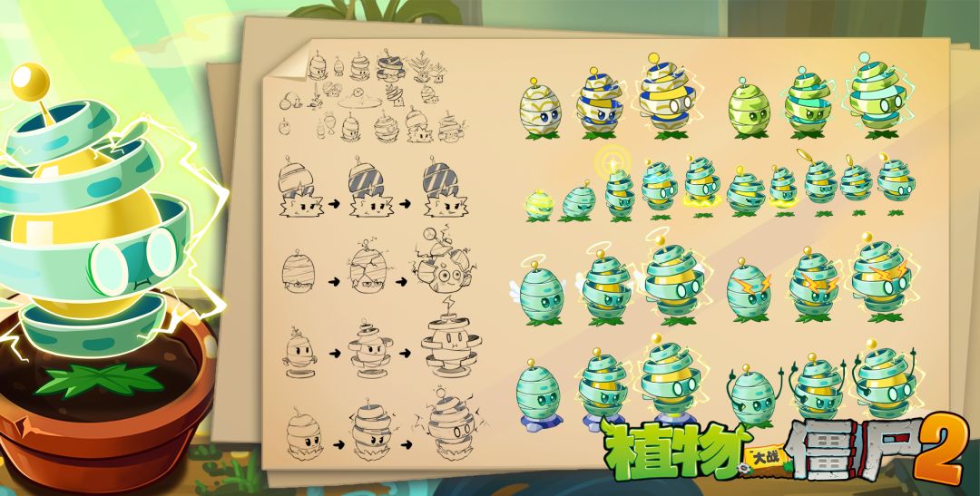 本次植物设计的过程中,制作组将雪松的松果与特斯拉电圈进行了原型联想,制作了一款与电系植物互相帮助的植物,以“蓄电”为关键词展开设计。