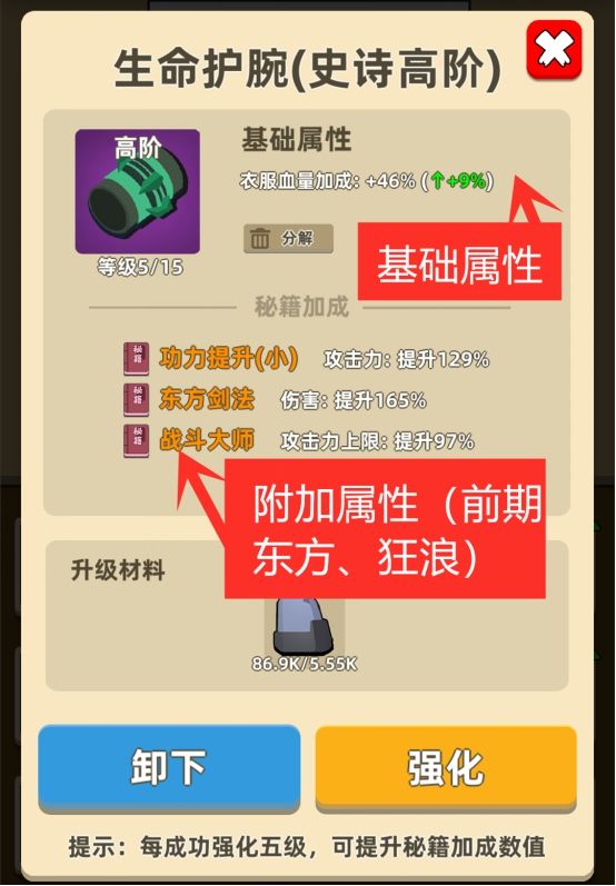 2、属性也是分基础属性和附加属性。基础属性为百分比增加装备的基础属性,附加属性为百分比增强秘籍。