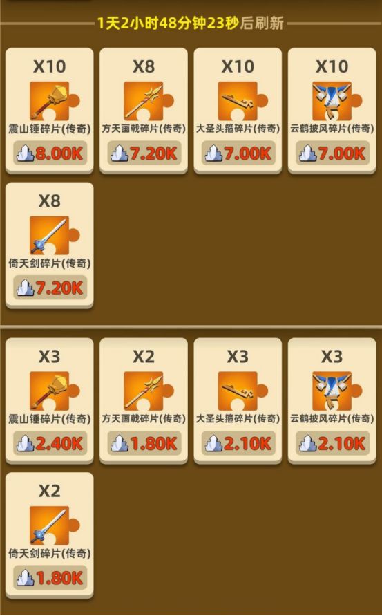 6.每周一固定刷新传奇装备碎片10个由荣誉值兑换,分别为屠龙刀,虎皮衣,斗笠,金箍棒。