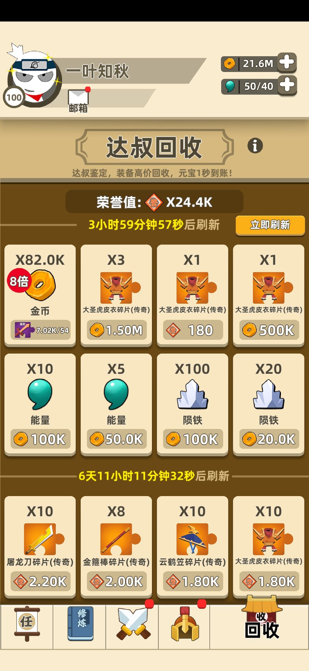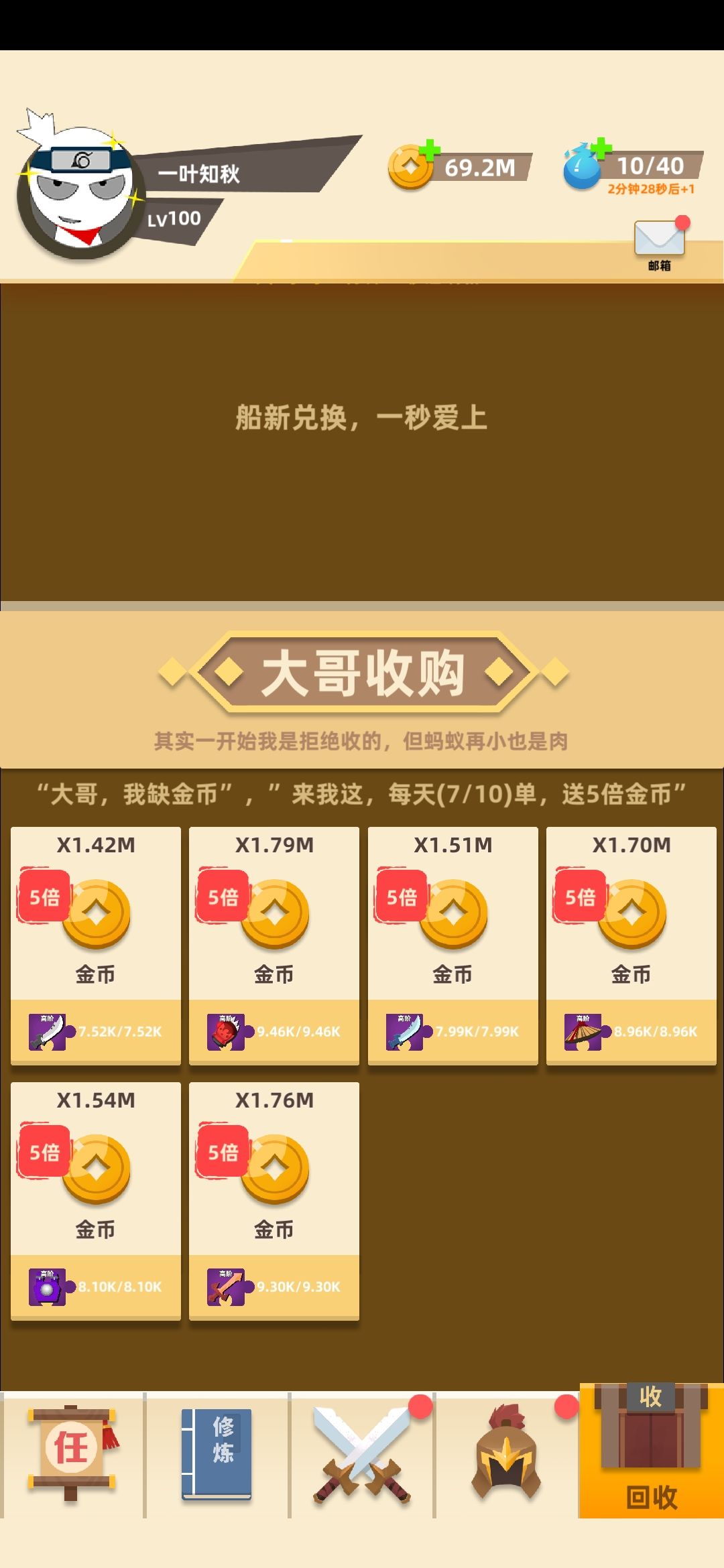 1.第一格子物品为:8-10倍回收装备碎片(前期金币紧缺看情况卖)。可广告翻倍5次