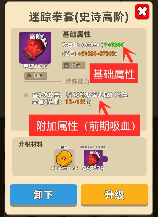 3、装备主要有两大属性,一个是基础属性,一个是附加属性。基础属性就是武器的攻击力,衣服的血量,帽子的减伤。附加属性就是吸血、持续伤害、暴击等。