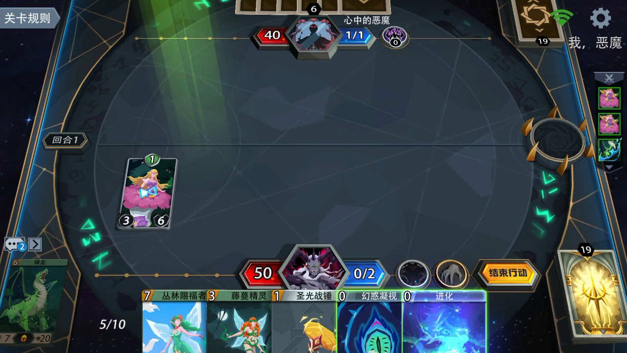 关卡攻略:优先多张低费卡上场(牵牛花灵最佳),用狐族守护兽+魔蛇手套秒杀(可搭配藤蔓精灵)。