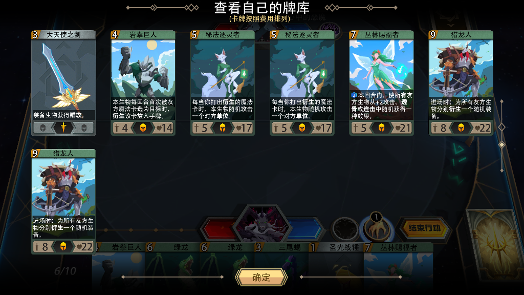 若回合9无法消灭对手,建议魔蛇手套、突击长戟等装备交给秘法逐灵者,利用我方打出衍生魔法卡该生物进行攻击的效果进行输出。