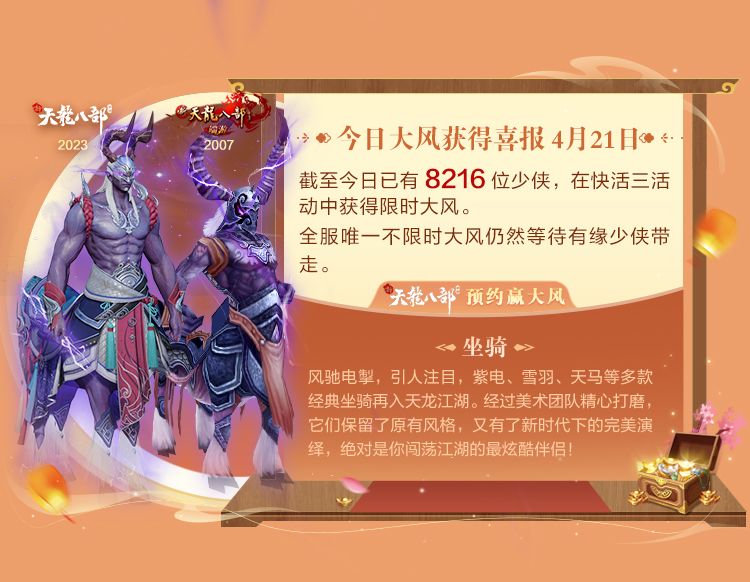 时光冉冉,潮起潮落,一个故事兴起,一个故事结束,不变的是天龙江湖的故事还在继续。未能抽取的大风,得不到的紫电……让各位少侠在行走江湖中留下一段遗憾。如今《新天龙八部》手游势必要弥补各位少侠留有的遗憾,快活三大奖传奇坐骑——大风获取概率直接堆满,让少侠们都能把大风骑回家。