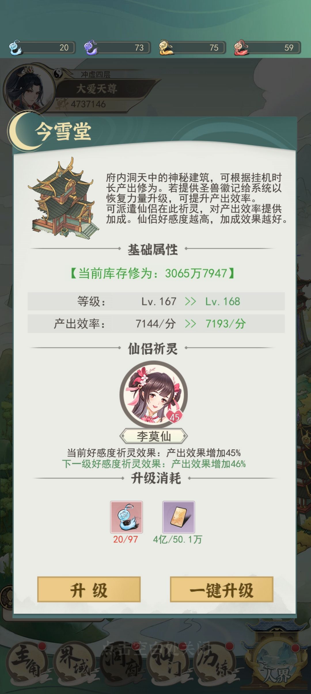 第六天 留了八万经验就等盟里大佬飞升,结果飞不动,开始呼叫援助,大腿进仙门,秒把修为增益加到11,感觉有3成把握达成挑战。斗法第九,青龙见图2,应该是上午截的,斗法后好像是154还是157,上午境界见图3。