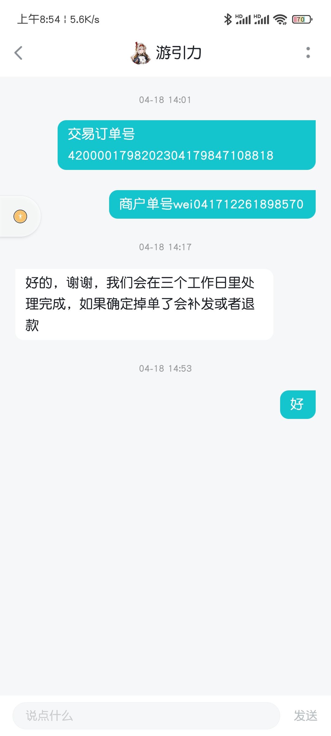 还非要说我这是老版本,我今天特意再看了一下是不是有游戏更新,重新又进了一次游戏,我的画面依然是有广告的,依然没有恢复购买的选项,另外这位客服问了我的订单号以后就没有影子了,3个工作日,今天已经22号了,我暂且等到下周3。