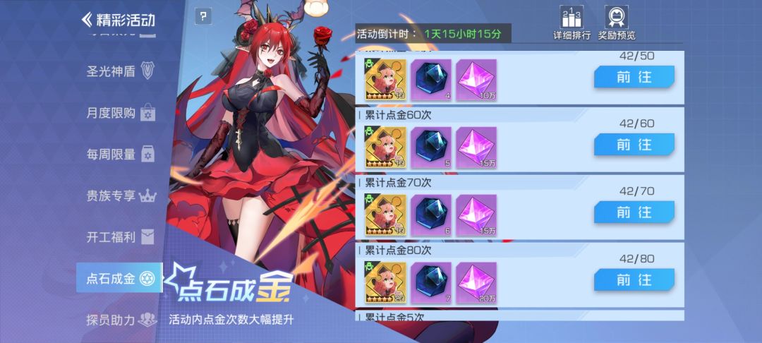 点金活动:我们白嫖玩家要合理利用手头上不多的资源,点金活动周拉满奖励为80次,每天分别会重置三次还是两次记不太清了,每次有三次免费点金,以及需要钻石的中档点金和高档点金。这里我们要算好除了三次的免费次数大概还需要多少就尽量在中档点金那里补满,不要溢出或者不够,因为我们零氪玩家钻石不多要用的地方多,所以不争排名,也争不过。做满任务奖励然后等活动结束领取排行奖励便可