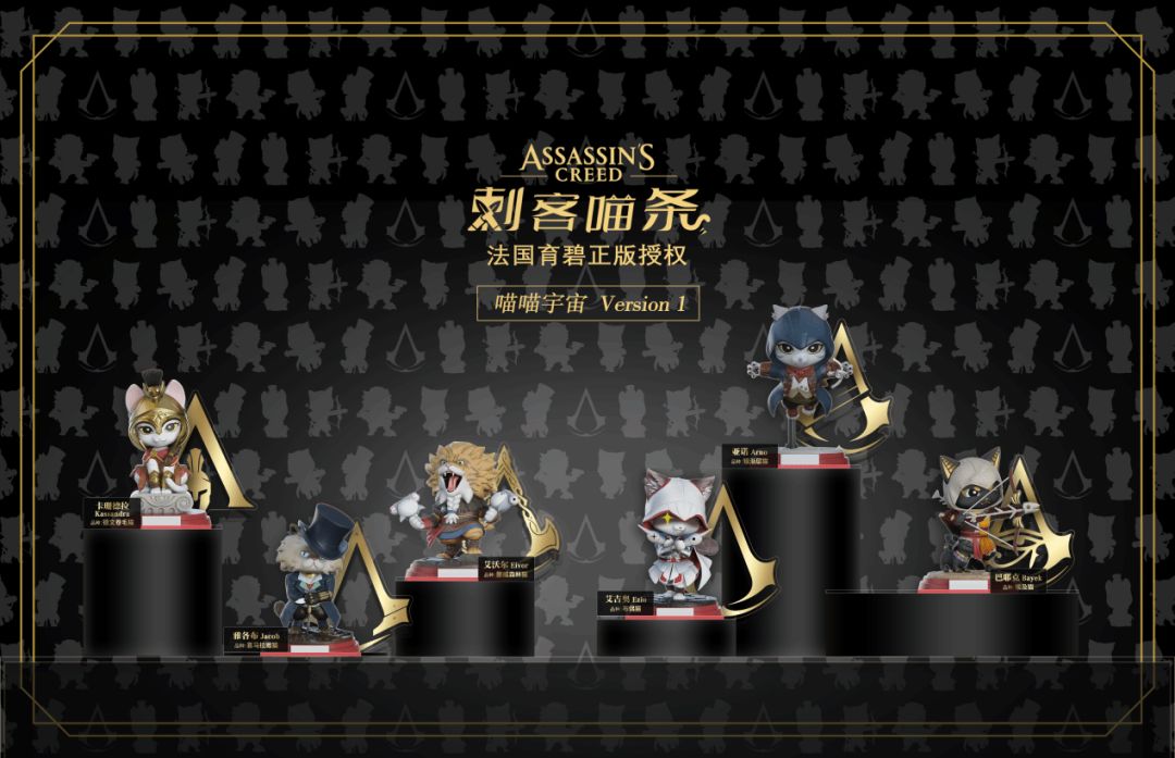 《刺客信条》x WUSTYLE喵喵宇宙是WUSTYLE推出的首个系列联名作品,常规六款选择了《刺客信条:兄弟会》艾吉奥、《刺客信条:大革命》亚诺、《刺客信条:枭雄》雅各布、《刺客信条:起源》巴耶克、《刺客信条:奥德赛》卡珊德拉、《刺客信条:英灵殿》艾沃尔(男),还有隐藏的特殊限定款,为艾吉奥的异色版。《刺客喵条》参照6位主角个性特征及人物背景,在猫界选择了6个人气品种,将各游戏系列主角逐渐喵化,经过无数细节打磨,打造专属于“猫奴们”的高品质潮玩收藏手办形象。