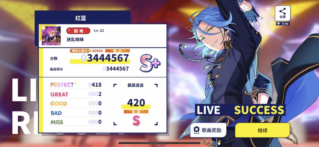 2、在【困难】难度,无改判达成「迷乱蜘蛛」Perfect Combo的制作人送上LIVE技能结晶*5
