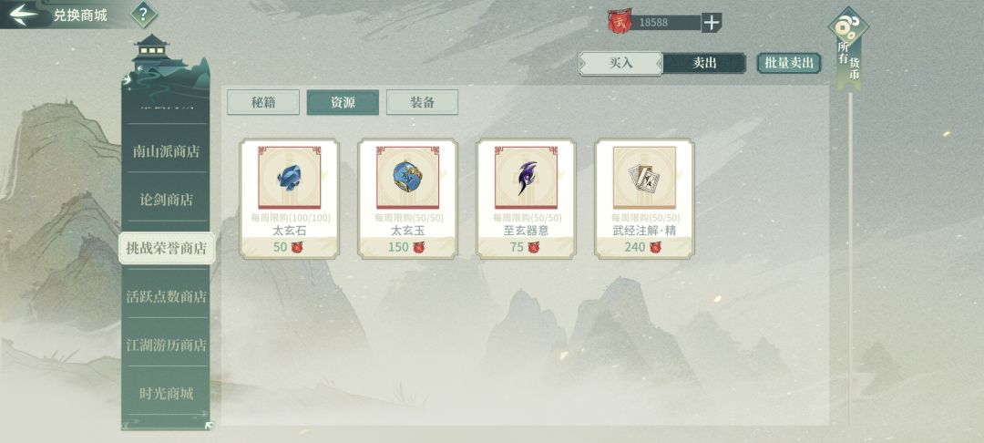 挑战荣誉和奇遇荣誉商店兑换问题。挑战荣誉商店前期优先秘籍,有用秘籍换的差不多之后开始换太玄玉……至于兑换优先级……我实在有点儿想不起来了,关于兑换优先级和商店购买秘籍的优先级,请截图之后询问我吧。奇遇荣誉商店我建议前期太玄石太玄玉都买掉,别的可以先不买,如果玩剑意的话。至于合成门派套需要的名俊令,玩剑魂华山阴华需要饰品和武器,天武需要的很多,八门遁甲需要饰品,别的门派应该是不需要。武学注解的话,等啥时候挑战荣誉商店秘籍换的差不多了,开始换太玄玉了,那奇遇荣誉这边就可以考虑开始换注解精了