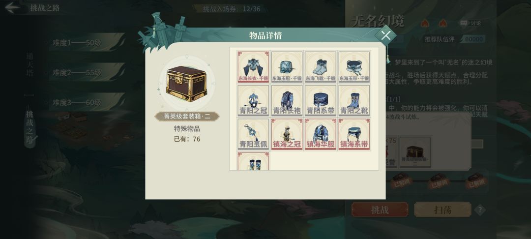 精英套装箱2,东海套现在使用率比较低。青阳套是另一套暴击装备,这其中青阳饰品非常不错,至于青阳套别的部分,优先级其实没那么高,因为暴击输出可以先用易水套糊弄嘛,效果差距不大的。镇海套,非常好用的套装,优先做,尤其镇海衣服,有非常好用和强力的护盾!