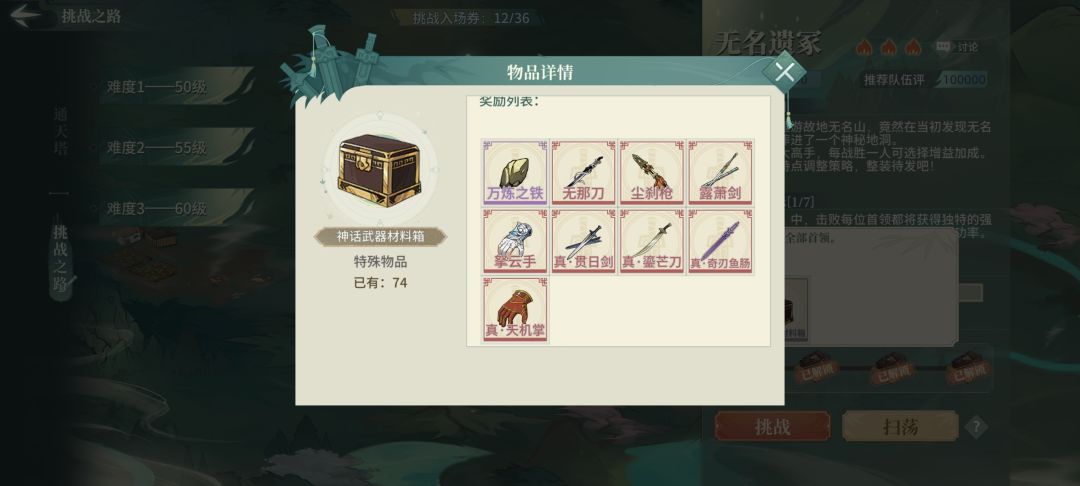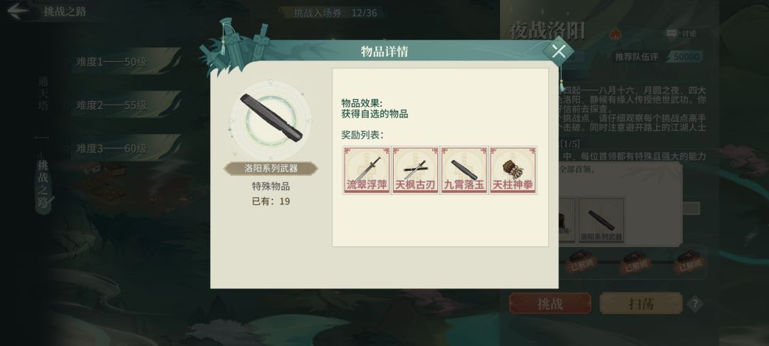 周一,周四,如果没鞋子就先扫一个夜战洛阳任意等级拿一个天枫鞋子,尽量满词然后升级千锻,主角用,伤害提升明显。做好后如果有太极拳可以搞一个观音佩千锻,之后夜战洛阳就长时间不用来了。铁石主鞋子可用星移鞋子或者业火鞋子。 无名遗冢扫荡55,主要把无名套装做一下,不过如果是剑意门派的话,可以考虑先做一个无名衣服就好,然后就开始扫荡60拿衣服和武器的升级合成材料。