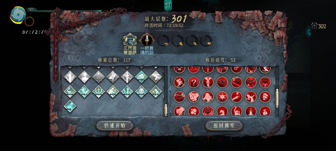 这把前面还是有点小胡的,重要秘籍和强化来得早,基本从头到尾都是一直秒,开局猪心+凝气草,可搭配空明武器过度,后面换无敌的太祖,我这把太祖属性算不上顶级,110冰强都没刷,但伤害溢出太多了也就无所谓了。圣物老一套猪心玄武+34号朱雀,精炼前期可以选点攻击力,后面全生命,后期精炼一次加几万血想死都难。梦魇秘籍方面我个人感觉梦魇浪潮不错,可以看做强化版的空明斩,范围很大,后面一个图随便砍几刀就过了,boss也都是一刀斩,但这些花里胡哨的词条建议100层成型后再选,前期还是优先拿那些加基础属性的强化。其他的暂时没想到,大家可以评论区讨论哈!