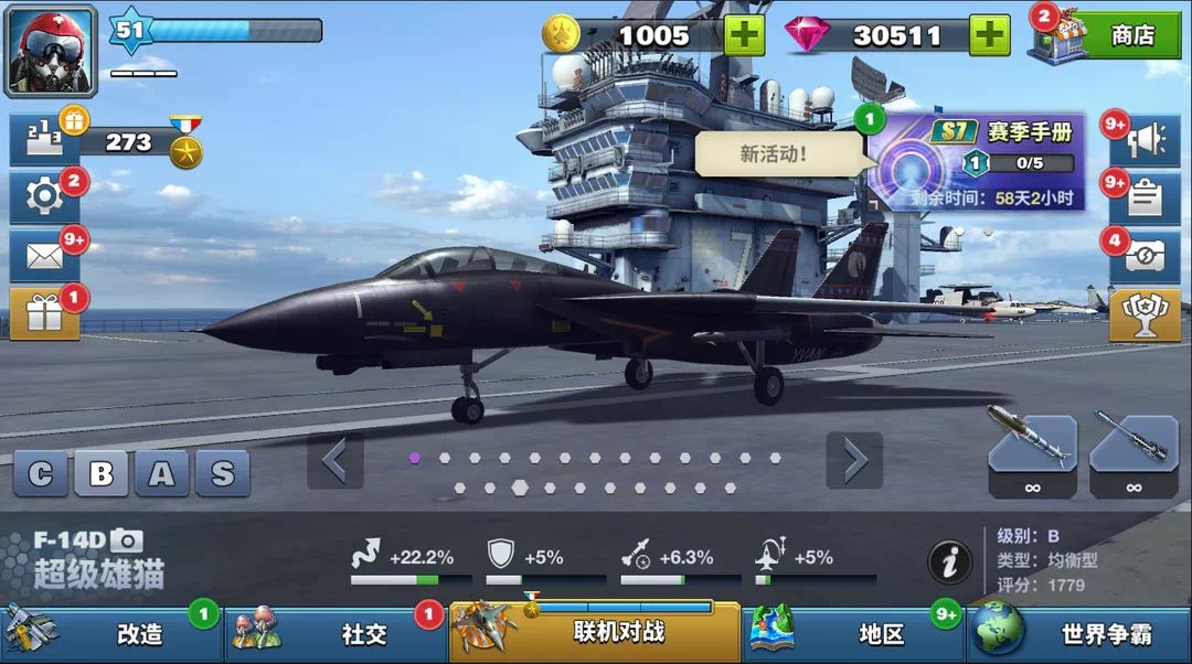 为了让大家能够更加清晰了解每一架飞机的特点和优势,我们为每架飞机设置了六维属性图和战机评分,大家在主界面右下角飞机菜单栏点击“i“按钮即可进入到属性界面。
