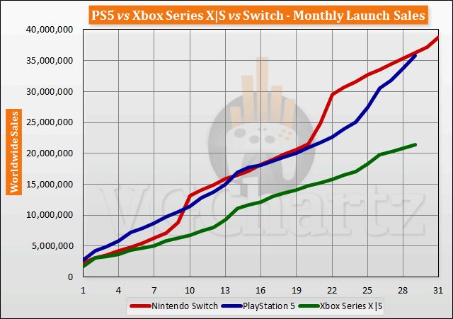 今日,vgchartz发布最新销量数据,比较了PS5、Xbox Series X|S和Switch发售前29个月的同期销量情况。