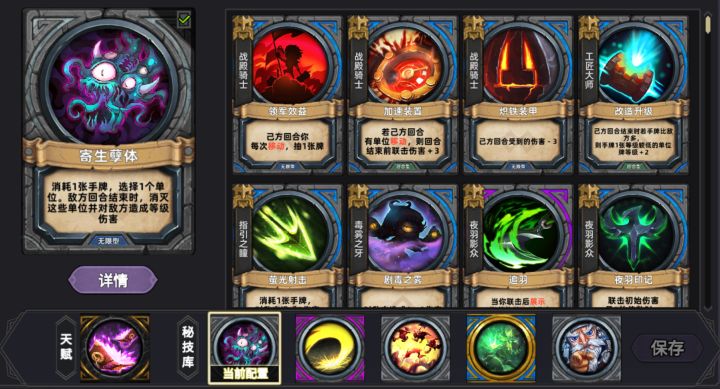 本人的寄生闪子流(图二),技能从左到右如下(核心闪子+核心寄生+3个爆发抽牌):寄生孽体(核心)+唤援闪子(核心)+先发制人+萨坦德+征兵令[推荐先发制人换成汲能装置,别问我为什么不配,问就是穷,没有汲能]