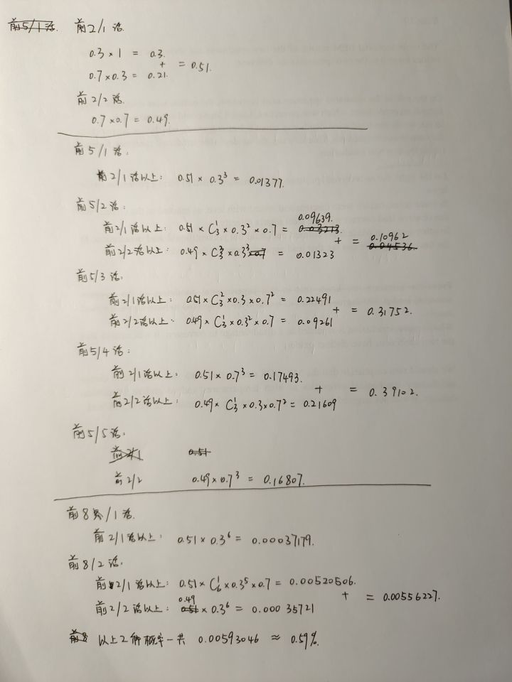 已知,活卡0.7概率,前2张必出1许愿ssr的规则没变,计算的是新增的“前5ssr必2活卡,前8ssr必3活卡”能排除以前最倒霉的情况:前5ssr只有1活卡,前8ssr只有1或2活卡。