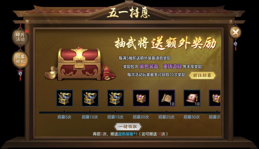 (4)其中1-180服,每招募满5次还会赠送额外装备道具奖励,最多可获得10次奖励。不同服务器所赠道具有所差异,玩家可前往招募好礼界面进行领取。