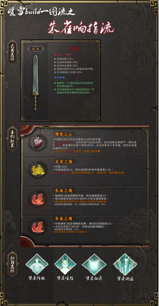 这套阵容的核心思路是爆发,圣物配置多找提高伤害的圣物,本套build中的憎恨之心既能提供高额伤害加成又能提供无敌效果,朱雀之魂提供防御属性和移送速度之后配合玄武之魂可产生连锁反应形成多倍率伤害,一轮飞剑后就可打出非常高的伤害。如果配合走火入魔还能再提升一个档次。