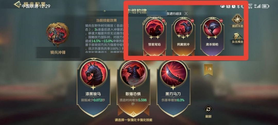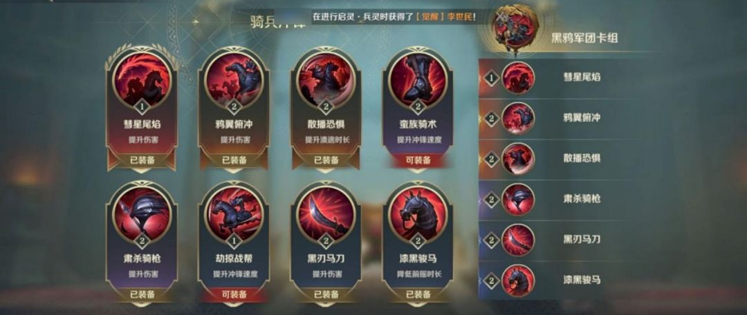【骑兵冲锋】自带伤害能力,因此建议装备提高伤害的卡牌,这样就可以在击溃敌军的同时还能打出高额伤害,压低对方血量,即便对方溃逃状态结束,其战力也会大打折扣。