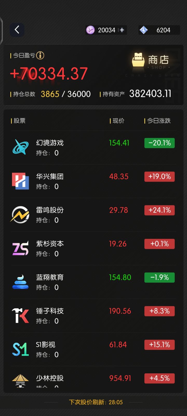 以上是我个人经验,我就第一周用钻石买了股票,第二周没用钻石买股票,用股票换了钻石,本金少,所以赚的不多