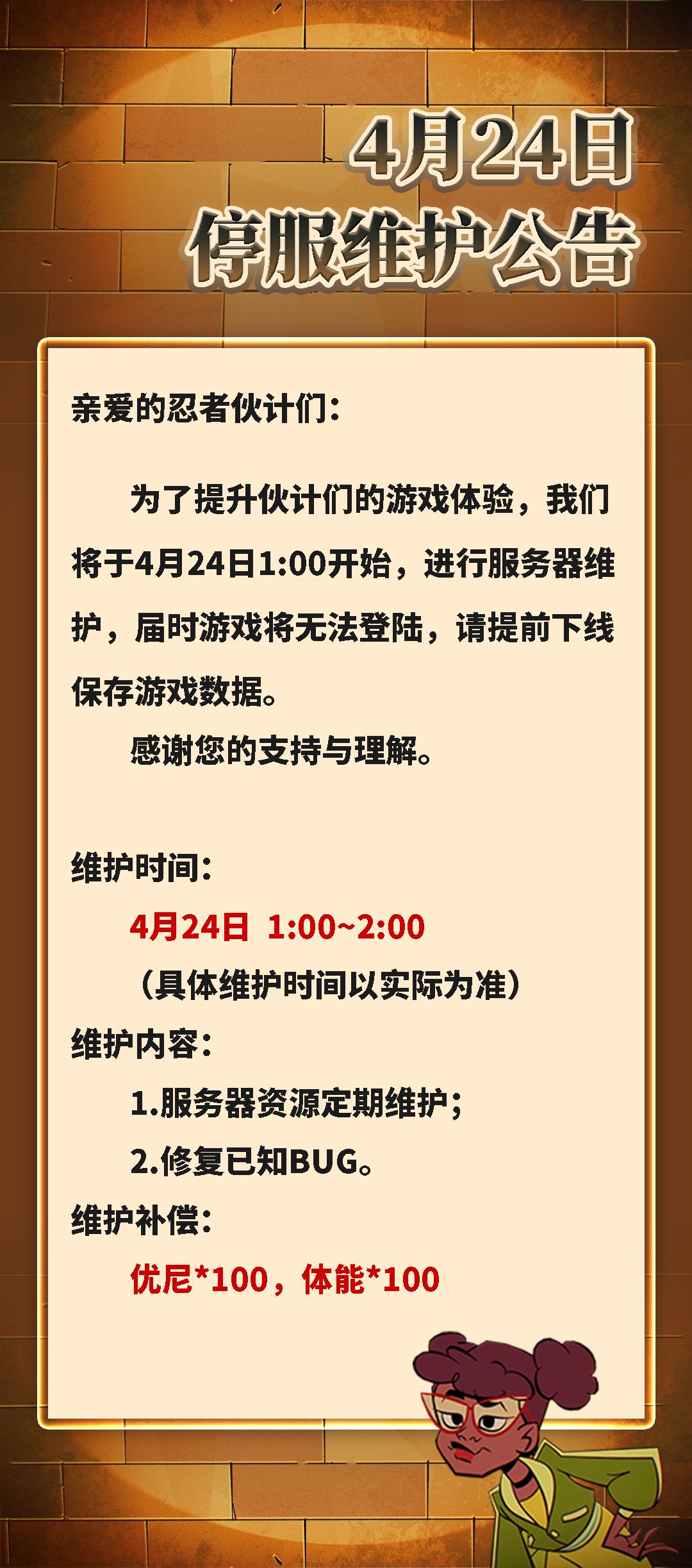 为了提升伙计们的游戏体验,我们将于4月24日1:00开始,进行服务器维护,届时游戏将无法登陆,请提前下线保存游戏数据。