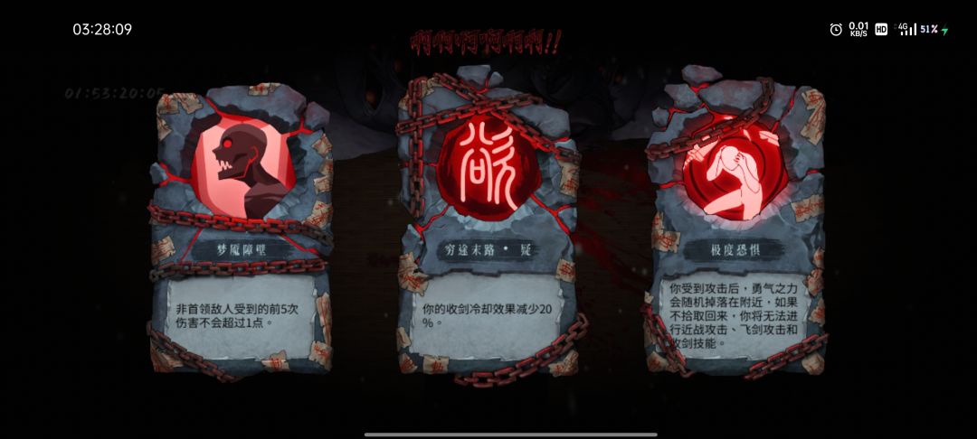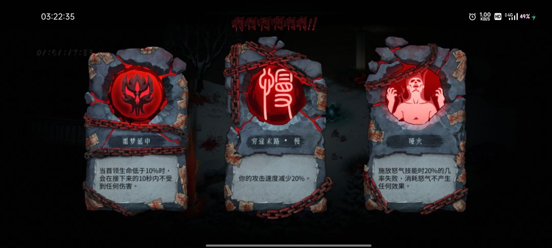 2.诅咒不好的时候可以点设置,点卡死重置来sl,有时卡死重置会卡死在卡死重置,这时候删后台重进就行了(ps:当你在站斗关卡sl重进的时候经常会有隐形怪突脸,sl进游戏时先放技能秒了就行)