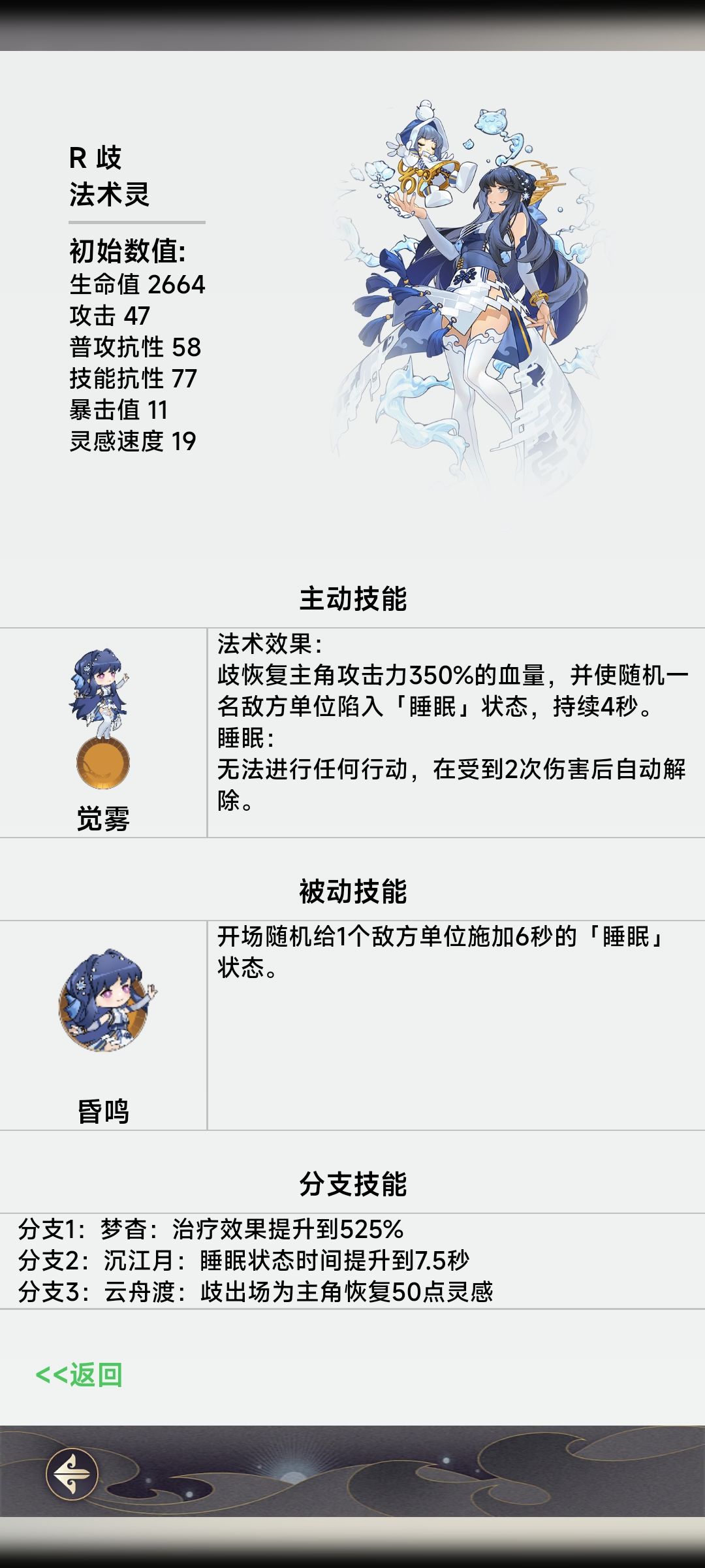 最后歧,虽然只是一张R卡,但千万不要看不起她。最早我是因为没有练两张SR奶妈才不得已带上她的,但打着打着我就发现歧居然是不可或缺的。她提供的6秒高质量睡眠往往是对局中胜负手,在我冲锋路上不知道帮我抢了多少分。其他也可以提供控制的角色,比如说斜谷和雾窥,你想用他们替换当然也行,不过我还是更推荐歧,原因其一是歧的一口奶蚊子腿再小也是肉,其二是睡眠可以完全封锁对方行动,更稳一点。