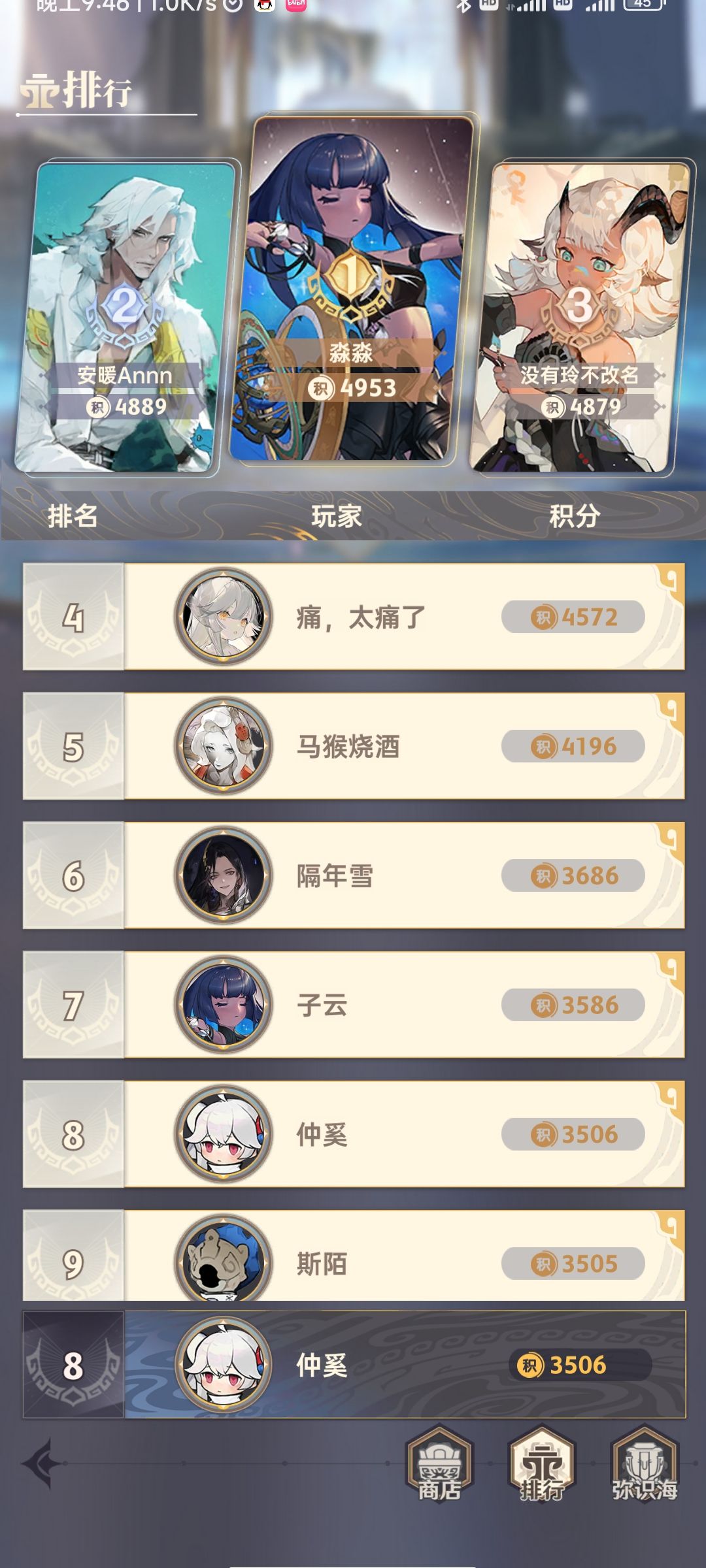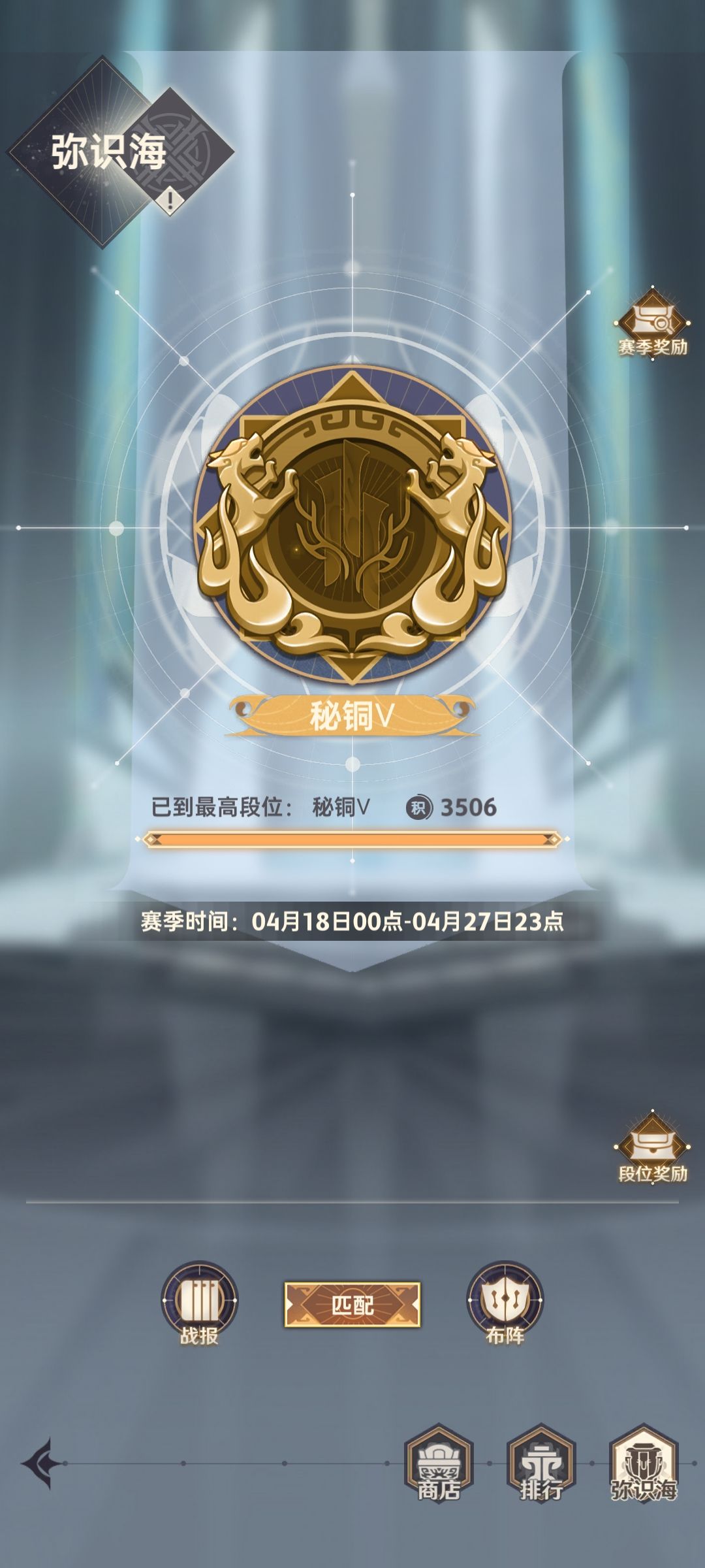 终于打到了秘铜5,段位奖励全都到手了,最后成绩是3506分第8名。(我是冲着段位奖励去的,没想到竟然要打到这么高才能拿到,太累了……)在这里叩谢一路上各位玩家和段位守护者手下留情orz