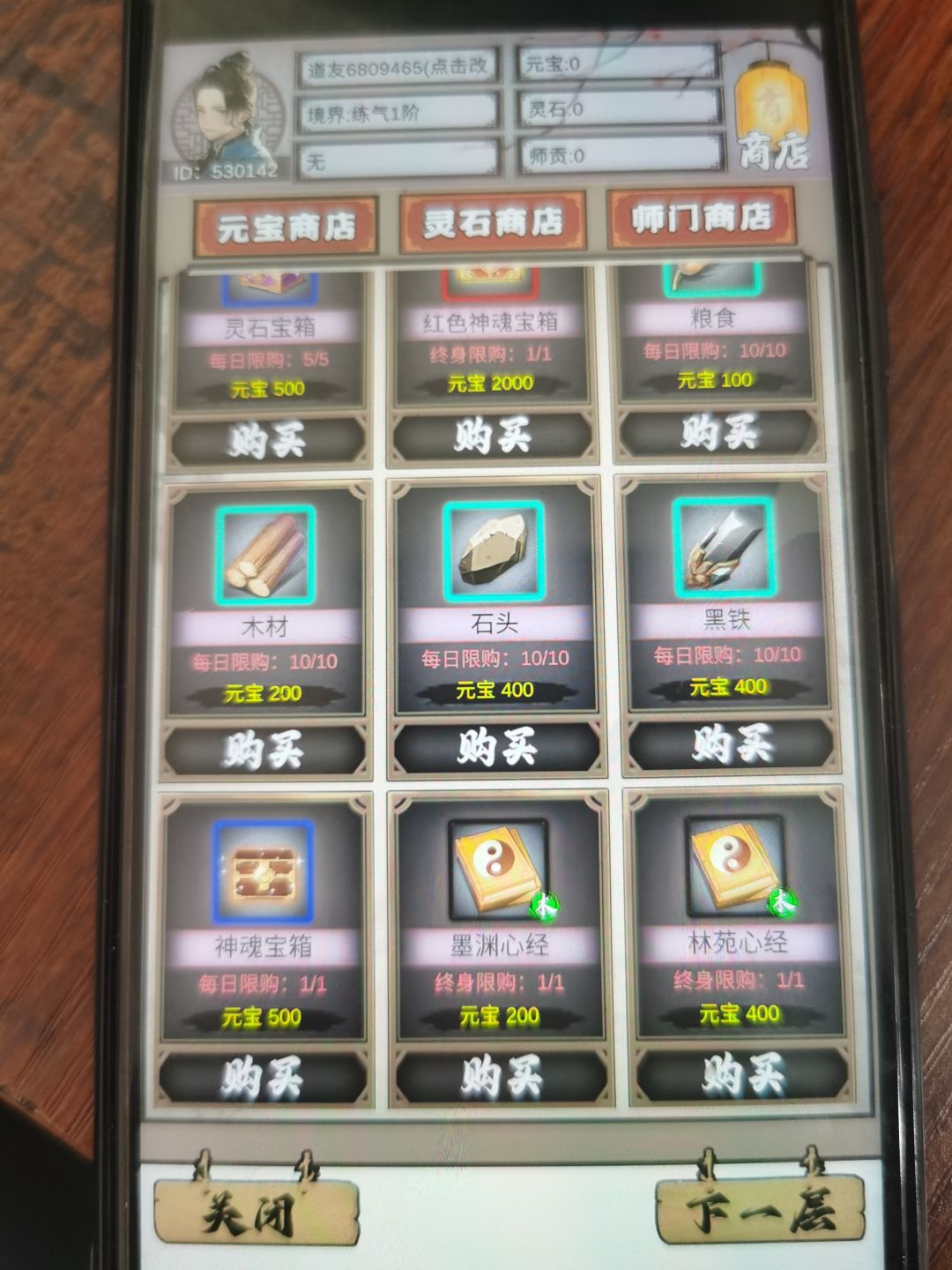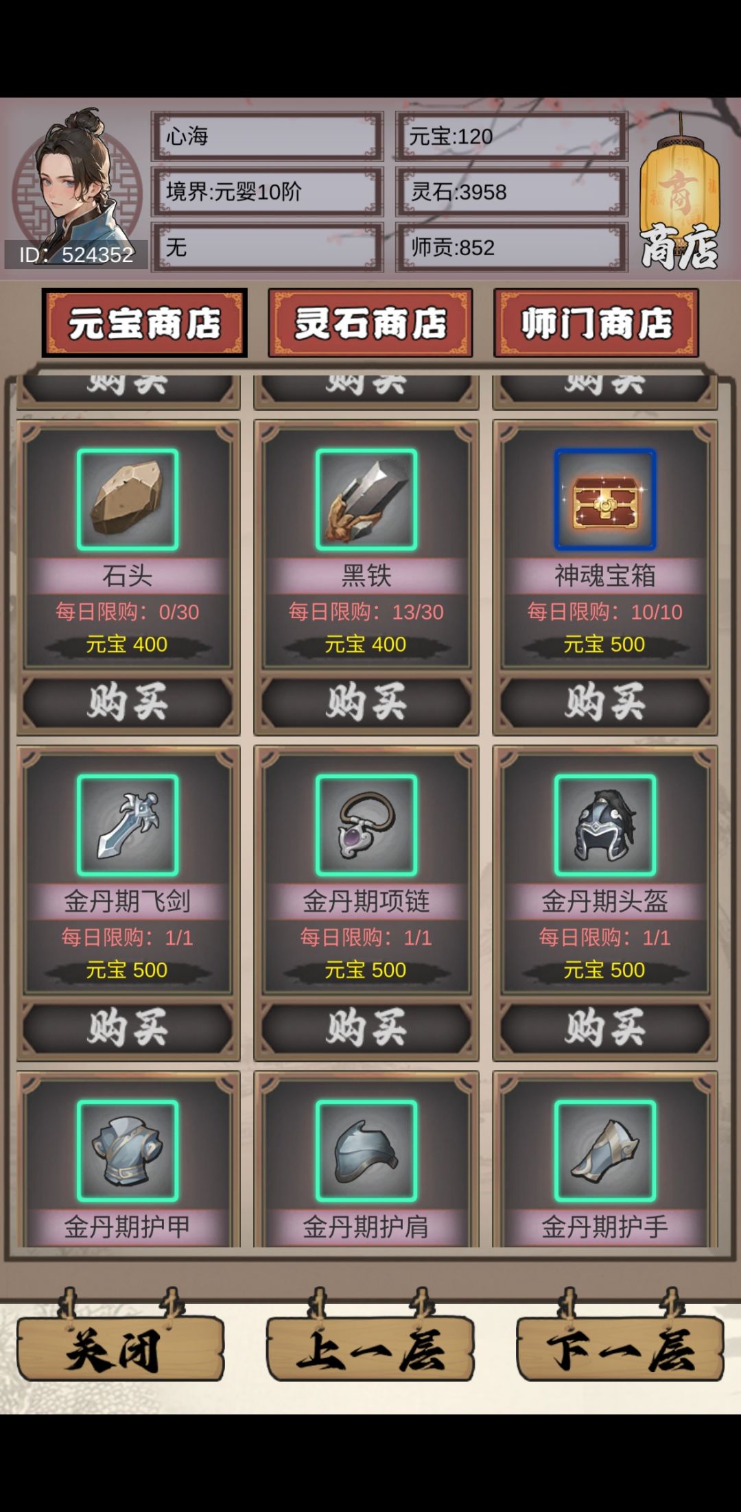 6.接下来就是游历里推图,打副本,每过 10层会给10个挑战次数 记住不要一次性扫荡完,不然副本其他任务都打不了需要次数的。打不过就商店买武器和护腕这两个位置都是加攻击力的,金丹元婴装备可以买下武器护腕,别的首饰作用不大,刷图就可以掉落。