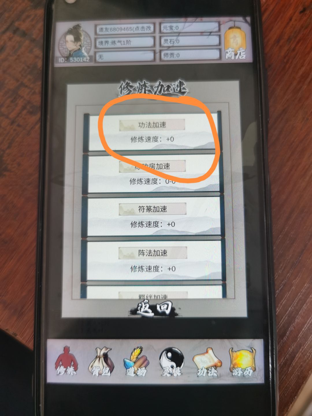 4.进入游戏点修炼 前期手动一下 ,到筑基期就能自动修炼了,接着道场优先升级稻田 和森林 这两个是相对应的,前期可适当用元宝买材料升级进度快些。这样才有足够的材料来提升灵根。提升灵根等级和修为挂钩都是相对应。
