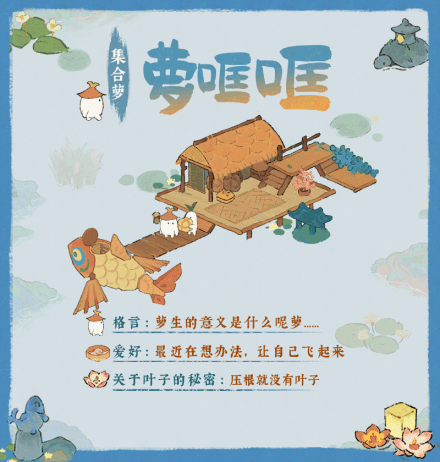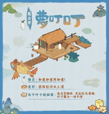 >> 萝叮叮是一只对任何事情都不气馁、精神满溢的积极爽朗萝。自认为天生过于普通,因此加倍努力、永不言弃。坚毅过人的性格甚至体现在叶子上,在盘点货物时,无论狂风暴雨,叶子始终岿然不动。闲暇时,萝叮叮也会磨炼轻功水上漂,将积极上进进行到底!