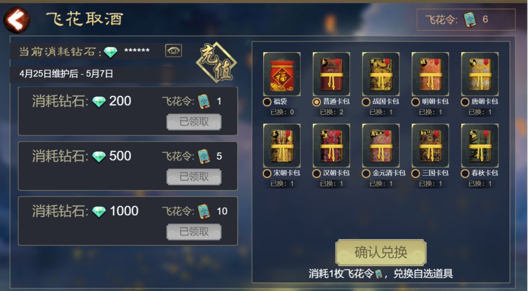 ※ 不同期活动可获得的「飞花令」数目可能会有所不同,但每1枚「飞花令」可兑换的奖品是固定的