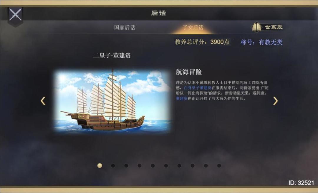 ※ 即,如果游戏内只有一两名子女,且这两名子女都出现在「国家后话」的话,「子女后话」将为空。
