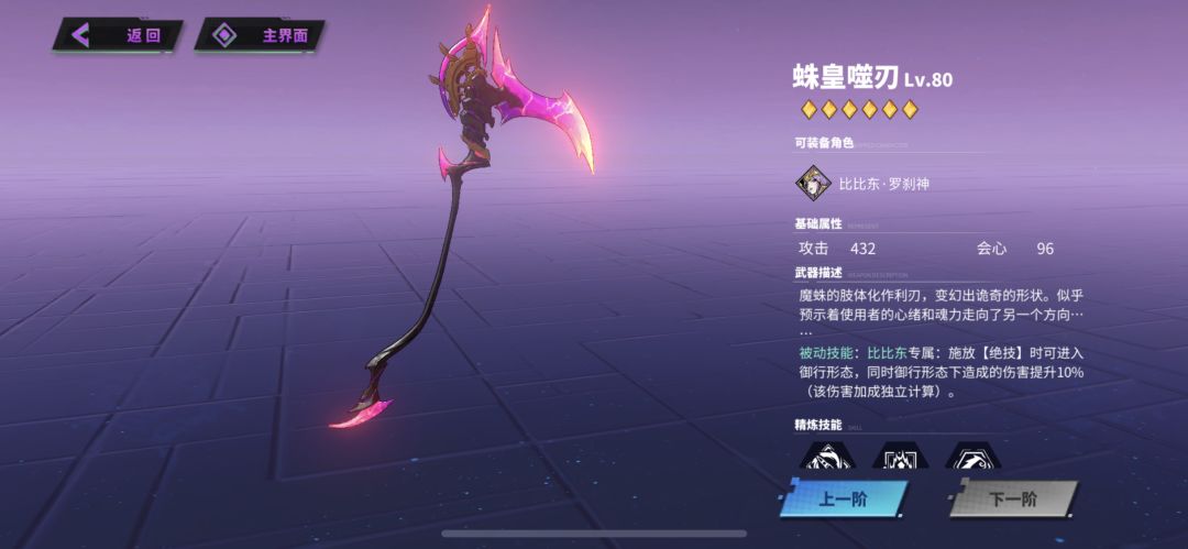 专武的被动效果非常关键,增加了一个进入御行形态的方法,让比比东可以通过【绝技】进入御行形态从而进行爆发。精炼2的效果更是让比比东的启动毫无压力,直接获得3格魔纹能量。