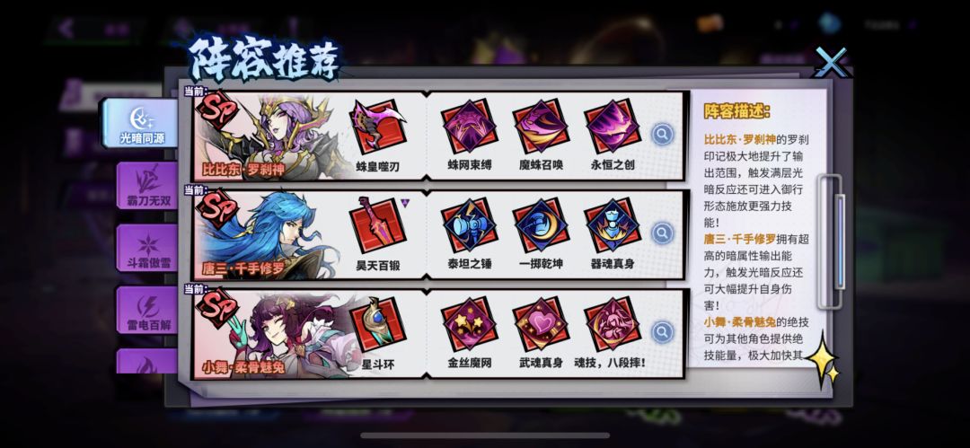 也可以携带荒城、破军等输出通用套装,这样的话就需要唐三来触发光暗反应,然后快速快速积累暗能,让比比东吃满【罗刹之怒】和【狂暴魔蛛】的被动效果,使用【绝技】启动进入御行形态进行爆发输出。