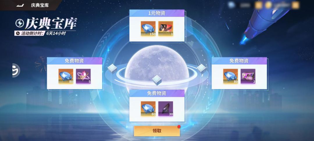 经纪人可前往庆典宝库,领取免费物资,或购买付费物资,领取当前物资后,随自然时间等待解锁下一个物资。