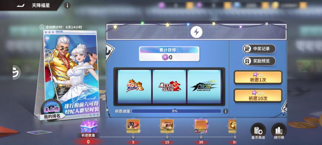 另外累计星币大于10000且排名前50可上星币排行榜,获得排行奖励,排行榜前六还可获得经纪人群星时装!