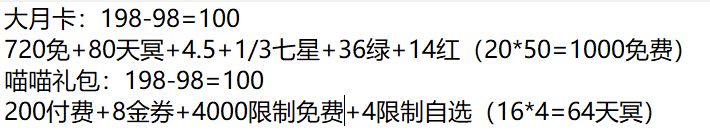 新礼包按性价比最高的198档来算,大月卡的票等价1000付费都按存钱罐的最低价98算,大概就能得到100块能买下的东西,还没考虑新礼包的时间问题。