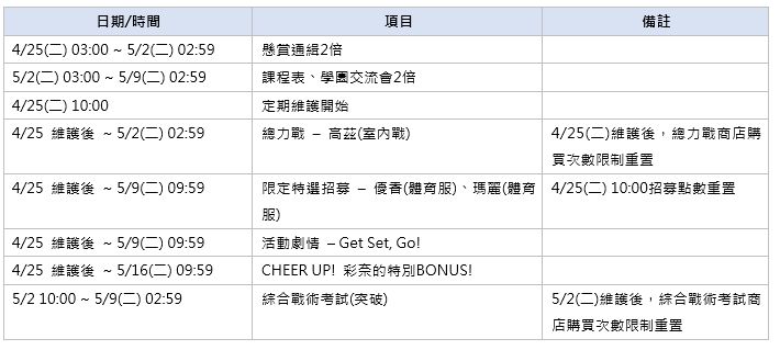 * 4月25日(二)10:00,總力戰商店內的商品購買次數限制重置