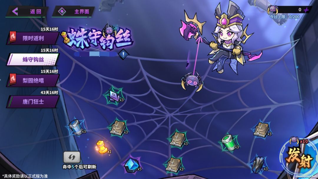 活动期间,消耗「强力蛛」道具钩取奖励,钩取成功可直接获得奖励。钩取棋子有惊喜奖励,可随机获得「神兵碎晶」「灵技碎晶」。 挑战完成日常副本可获得「强力蛛」。 ※日常副本:芦花古楼-四圣幻境、芦花古楼-突破战域、百鬼夜行、恶体挑战。