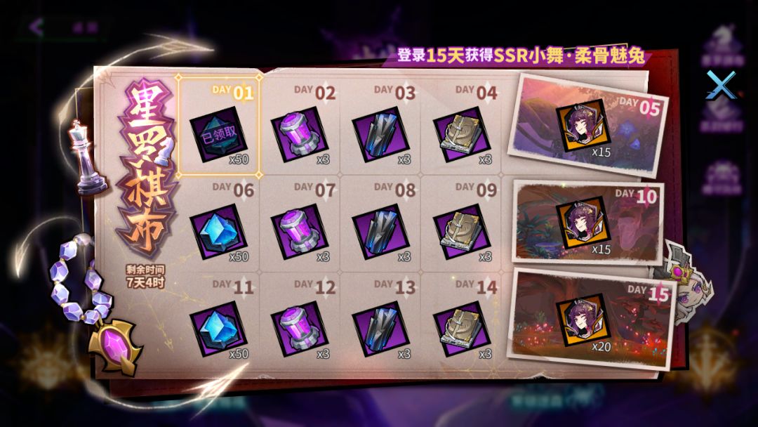 每日登录游戏签到,即可通过【星罗棋布】获得签到奖励一份!还可合计获得「小舞·柔骨魅兔」碎片*50,即签到15天获得SSR「小舞·柔骨魅兔」!